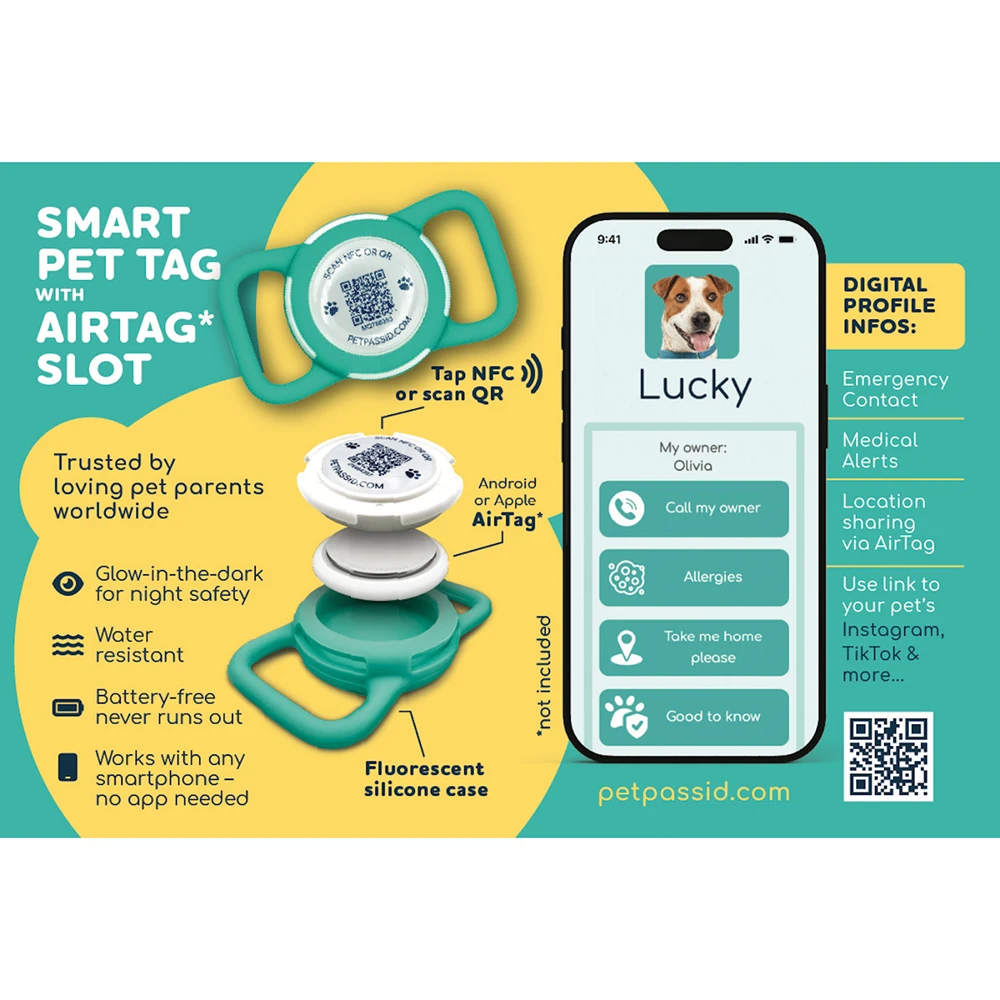 This smart tag combines NFC, QR code, and optional AirTag support in one durable and stylish solution.